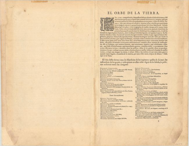 Ortelius' beautiful oval world map is a simplified version of Mercator's influential map of 1569. From surviving correspondence, it is known that Mercator encouraged Ortelius and provided him with information, particularly with coordinates of places in the Americas. This is the first state of Ortelius' third world map updated with the more correct shape of South America and the first depiction of the Solomon Islands off the coast of New Guinea. North America is nearly bisected by a lengthy St. Lawrence River, and the lands of Anian Regnum and Quivira are noted on the western coast. The Atlantic Ocean is filled with phantom islands, including Frieslant, St. Brandain, Brasil and many others. A huge Southern Continent incorporates Tierra del Fuego, and the mythical lands of Beach, Maletur and Lucach. The oval projection is surrounded by an intricate strapwork design with four corner medallions containing quotations from Cicero and Seneca. Spanish text on verso, published in either 1609 or 1612.