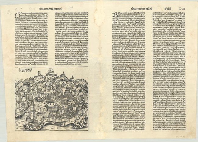 A superb panoramic view of Rome, and one of the only obtainable 15th century views of the city. The sprawling city is shown along both sides of the Tiber River, and important locations are labeled in the view, including the Colosseum, the Pantheon, the Vatican, and Castel de San Angelo. On verso is a smaller, equally fine view of Genoa. On a sheet of Latin text measuring 23.4 x 16.5".