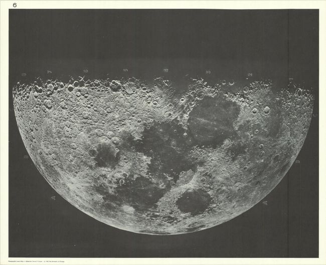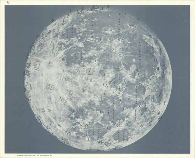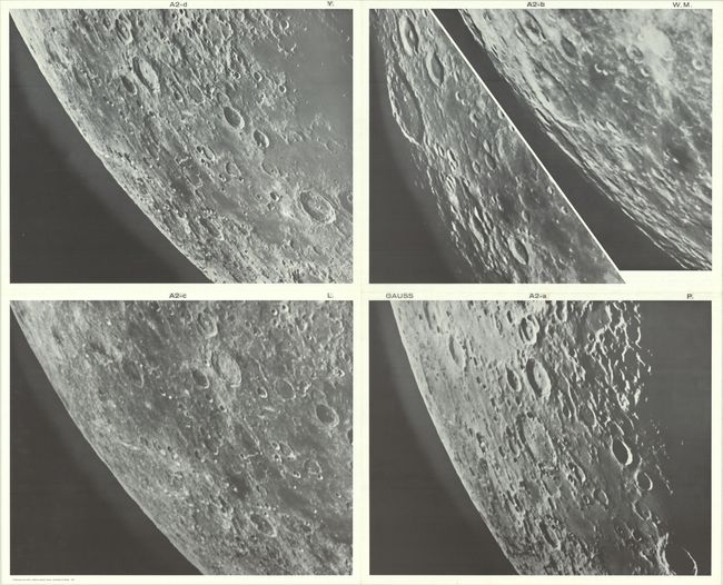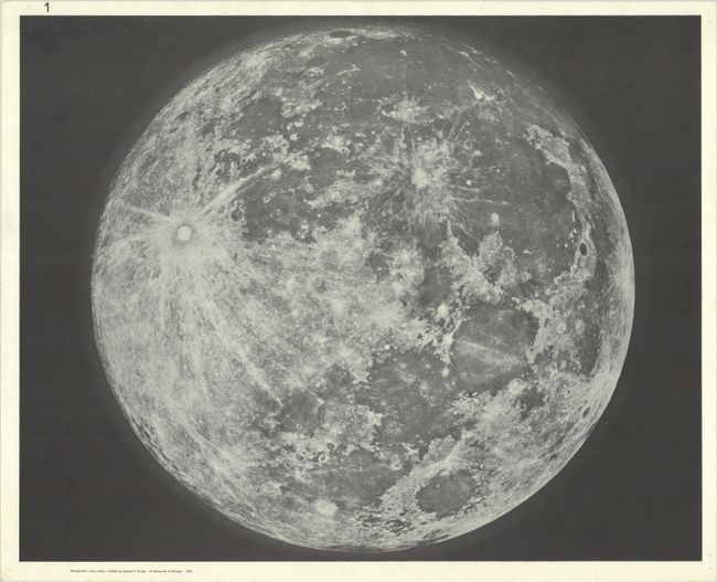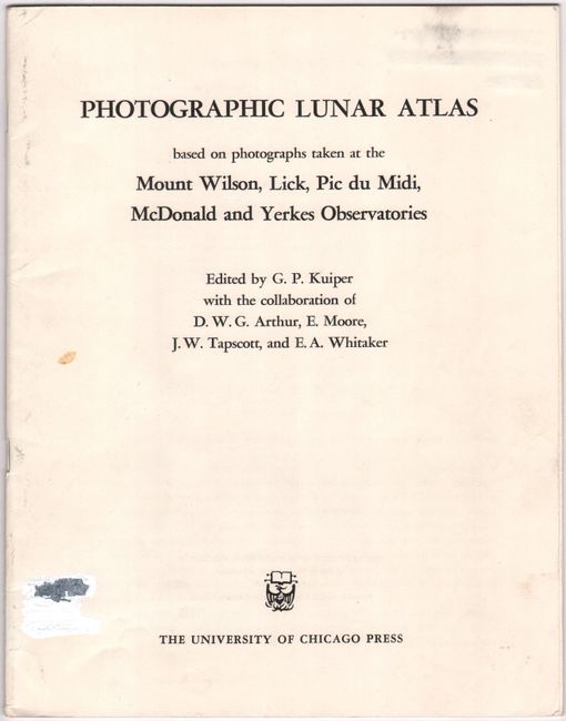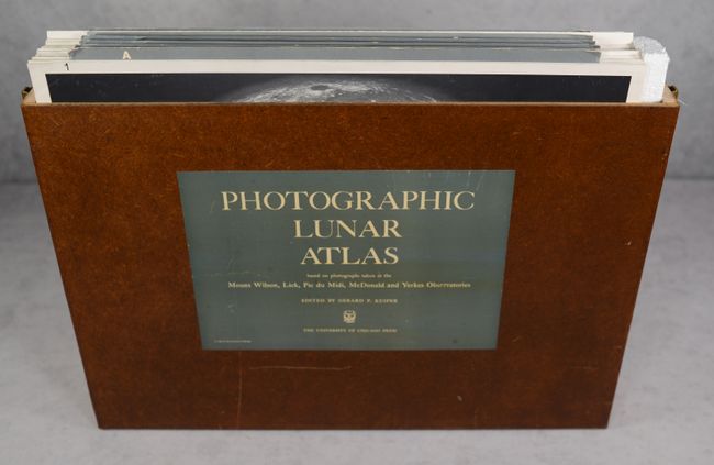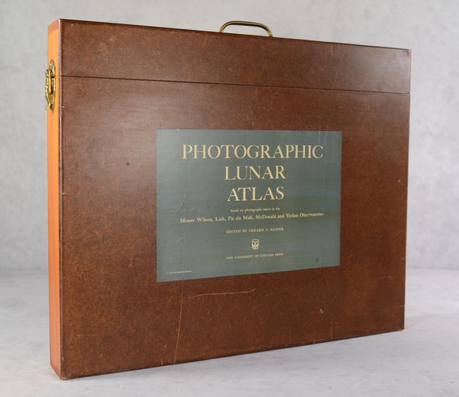 This is an exceedingly rare edition of Gerard P. Kuiper's important lunar atlas, with the plates housed in a hard wooden case with metal latches and a carrying handle. Commissioned by the United States Air Force, the atlas consists of 230 photographs (on 93 sheets) of the moon taken from five different observatories. The atlas is split into three parts: an introduction (11 sheets) "showing the subdivision of the lunar surface into the 44 fields" and presenting the nomenclature officially adopted by the International Astronomical Union; the main body of the atlas, consisting of 184 photographic plates, most on folding sheets; and 35 supplemental sheets. In this example, the sections of the main atlas are grouped by dividers labeled A - F. The photographs were taken at a scale of 100 inches to the lunar diameter (1 inch = 21.6 miles). South is oriented at the top of each plate, as is customary in astronomical photography. The atlas is accompanied by a 23-page booklet describing the history of the Lunar Atlas project, information on the photographs taken, and tables of data and lunar formations to be used with the plates. The plates are loose sheets that tuck neatly into a nice wooden case with a removable lid with carrying handle that fastens to the body of the case via metal latches. A title label is attached to the case's front. Edited by Gerard P. Kuiper and published by the University of Chicago Press. William B. Ashworth, Jr., the cataloger behind the Linda Hall Library's "The Face of the Moon" exhibit, describes this as "the last great photographic lunar atlas based on images recorded from earth." This is the only example we have come across featuring the special wooden carrying case.