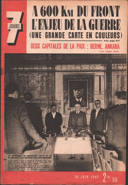 This fascinating World War II-era map was published only a month before Operation Edelweiss initiated the Battle of the Caucasus. The map emphasizes the importance of oil in the Caucasus to the Soviets and oil in Iraq and Iran to British soldiers in Africa and Asia, and expresses anxiety over what may happen if those supplies are cut off. It depicts the region from the Sea of Azov south to the northern tip of the Persian Gulf and Shiraz. There is French text throughout the landscape with information on the region, and a legend identifies oil fields, forests, steppes, deserts, oases, oil refineries, and more. Pipelines are depicted in red. Inset maps at left show the oil fields of Baku (a German target in Operation Edelweiss), oil production and consumption around the world, and the Anglo-Soviet invasion of Iran. The map was designed by graphic artist Jacques Mercier for the June 28, 1942 edition of 7 Jours. The entire issue of the magazine is included here, with Pierre Laval, leader of the Vichy government, on the cover.