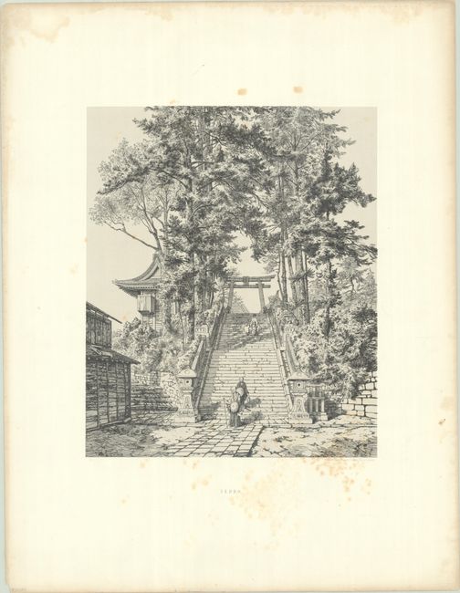 The images that were captured by Berg and Heine were published in a limited edition of 500 copies. This image depicts several people walking stone steps to a temple in Jeddo (Edo), Japan, which later became Tokyo. The photolithograph is on india paper and mounted on a heavy card, as issued. The card measures 27.3 x 21.2".