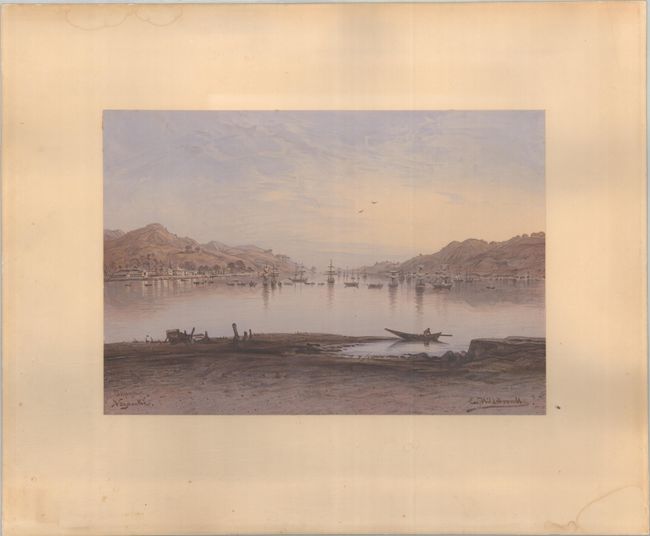 This gorgeous chromolithograph of the bay of Nagasaki, Japan was published in Berlin by R. Wagner. The chromolithograph is based on a watercolor by German artist Eduard Hildebrandt (1818-68). Hildebrandt took a trip around the world from 1860 to 1862 and chronicled his adventures with a series of stunning watercolors. Wagner published a collection of these as chromolithographs in 1864. The originals were exhibited a few years later at London's Crystal Palace. Mounted on a backing board, as issued, with publisher's imprint on verso.