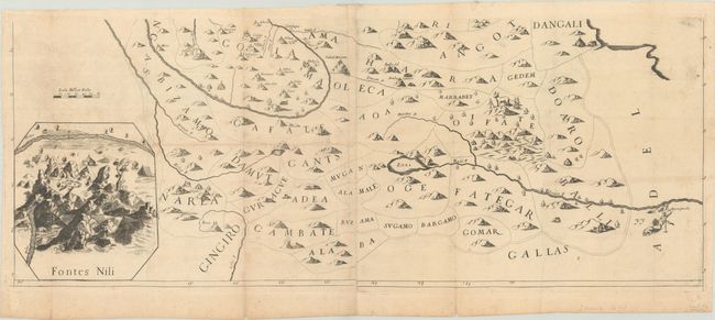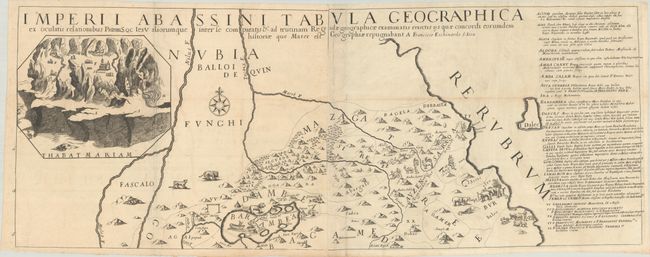 This scarce four-sheet map was produced by little-known Italian mathematician Francisco Eschinardi (Eschenard). The map focuses on the region around today's Sudan, Ethiopia and Eritrea, extending from the Nile River east to the Red Sea. The map is filled with elaborate mountain ranges, long rivers, place names, and fantastic depictions of both natives and animals including camels, elephants, lions, and a ferocious bear-like creature attacking a boat in a lake named "Bardambea." Features inset maps of the mountaintop "Thabat Mariam" at top left and the source of the Nile River at bottom left. A table with place name descriptions fills the right-side of the upper sheet. The sheets have been joined into a northern and southern pair. Not listed in Norwich or Betz.