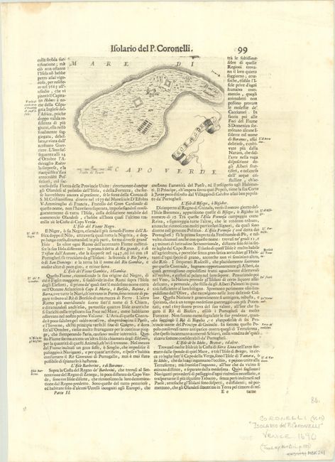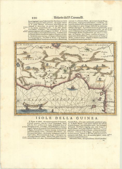 This charming map of Western Africa contains spurious information and lovely decorative elements. Information is largely confined to the coast and the Niger River, which flows in perpendicular to the equator, with a large lake (Lago Grande). The interior is filled with mountain ranges, a few rivers, and a number of depictions of animals, including elephants, lions, monkeys, and a crocodile. The distance scale appears on an ivory tusk held by putti wading through the ocean. On recto is a small map of Goree Island, located just south of Dakar, Senegal. On a full sheet of Italian text measuring 14 x 19.5".