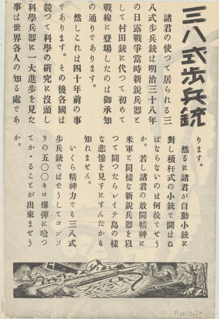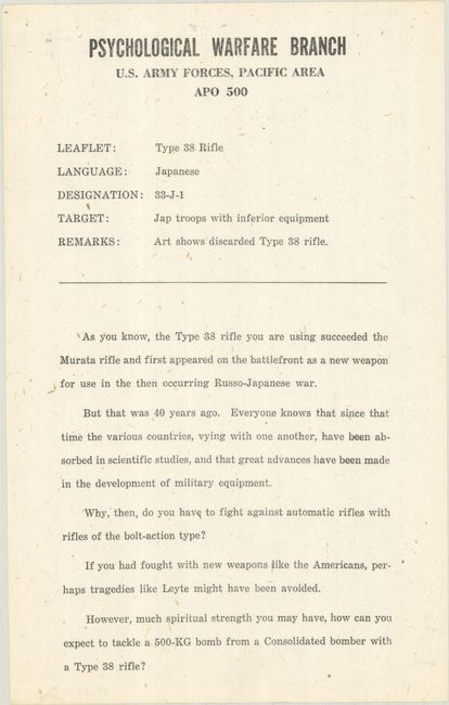 This well-preserved leaflet was produced by the Psychological Warfare Branch of the U.S. Army. It was dropped by U.S. forces on "Jap troops with inferior equipment." The illustration shows a destroyed building with discarded equipment in the foreground, including a Type 38 rifle leaning against a blown-out wall.