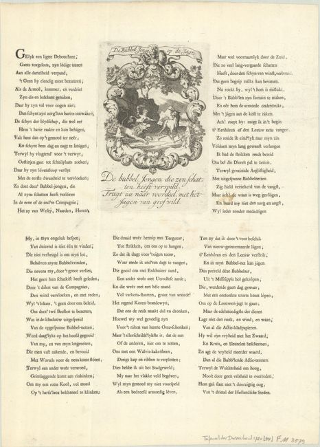 This engraving is from the important account of one the most infamous financial meltdowns in history, known as the Mississippi Bubble incident. This engraved view depicts a child, having lost all his "treasures," attempting to hunt a lion and a unicorn with only a torch. There are five columns of verses in Dutch surrounding the scene. Engraved by Pieter van den Berge. The full sheet with Dutch text measures 11.5 x 15.9".