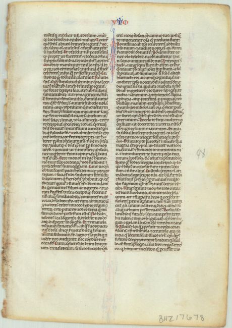Fine vellum leaf from a French Bible. In Paris, the birth of the Bible as we know it took place around 1200, when for the first time it was bound into a single volume; the order and names of the books were standardized and the text was divided up into numbered chapters. The scribes employed headings at the top of each page and used blue and red initials to mark the beginning of each chapter - such as on this sheet with "DE" at the top of the page on recto and "UTO" on verso, which together form "Deuto," an abbreviation for Deuteronomy. The text of this leaf is written in a very regular gothic hand, in two columns, 50 lines, with pen work in red and blue. This leaf includes chapters 4-6, which focuses on Moses teaching the Israelites about God's laws and the 10 Commandments.
