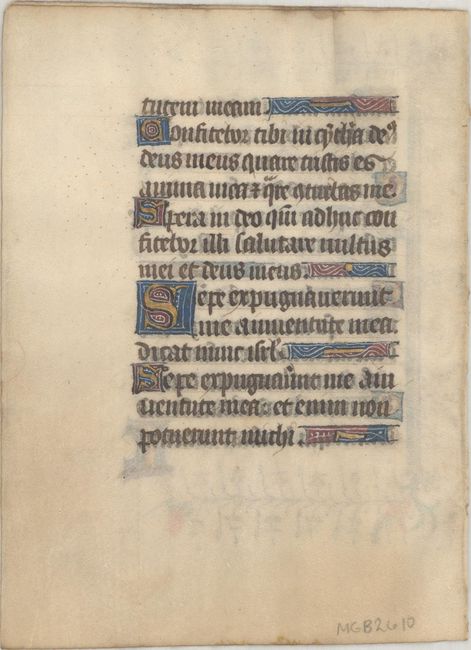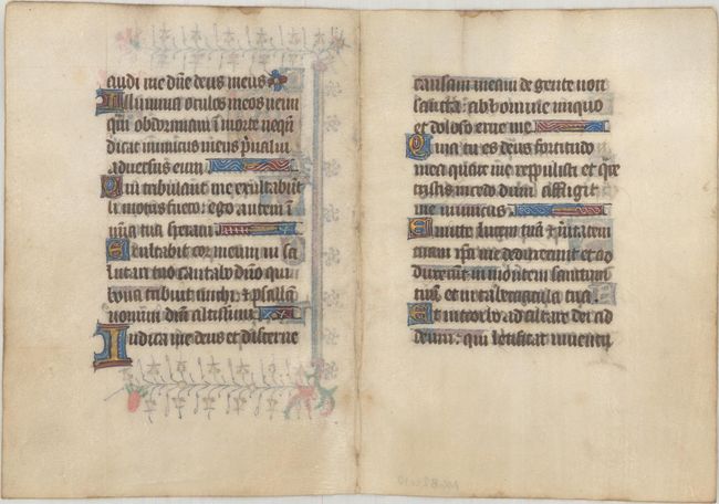 This vellum bifolium comes from a French Book of Hours, written in a regular book hand in or near Rouen. Each page is illuminated on both sides with numerous initials and line fillers in red, blue, white and burnished gold leaf. A large, three-line historiated initial 'C' dominates the recto, which is further embellished with a beautiful floral panel in the margins. Beginning with the large "C," the text translates in part as:
