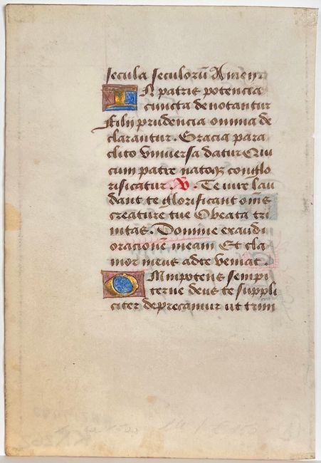 This is a lovely, small leaf from a Book of Hours created in France. The delicate text has 5 small initials in red, blue and burnished gold leaf with the remainder of the text in dark brown ink with blue and red line fillers. Beginning with the illuminated "D" on recto, the text translates in part as: