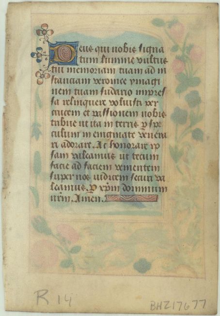 This is a lovely vellum leaf from a Book of Hours created in Flanders. The verso features a superb hand-colored image of the crucifixion of Jesus, surrounded by a frame-style border filled with leaves, flowers and fruit. The recto includes an initial illuminated in red, blue and burnished gold leaf.