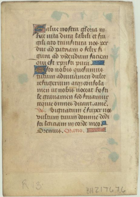 This is a lovely vellum leaf from a Book of Hours created in Flanders. The recto features a large initial and a frame-style border filled with leaves, flowers and fruit. There are two small initials illuminated in red, blue, and burnished gold on the verso. Beginning with the large "S" on recto, the text translates as: