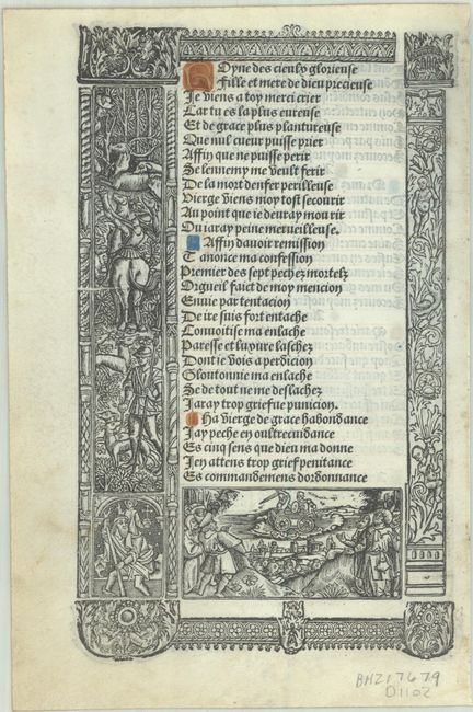 Unusual vellum leaf printed in Gothic textura type with illuminated capitals in red, blue and burnished gold leaf. The text is primarily in French (with only "Ave Maria" in Latin) and is surrounded by elaborate iron engravings that include plants, animals, hunters, a unicorn, as well as several biblical scenes. Printed vellum Book of Hours leaves are very scarce, as they were only produced between 1496 and 1530. The text translates in part as: