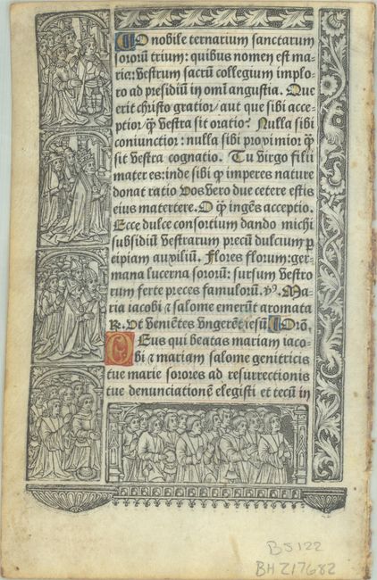 This buttery vellum leaf features a hand-colored image on recto of the Education of the Virgin, featuring Saint Anne teaching a young Mary to read from a book. The accompanying text translates as: "A heavenly privilege entered into Ann, through whom the Virgin Mary was born to us. Pray for us, blessed Anna, that we may be made worthy of the promises of Christ." The text is surrounded by elaborate iron engravings that feature plants, flowers, mythical creatures, and biblical scenes.