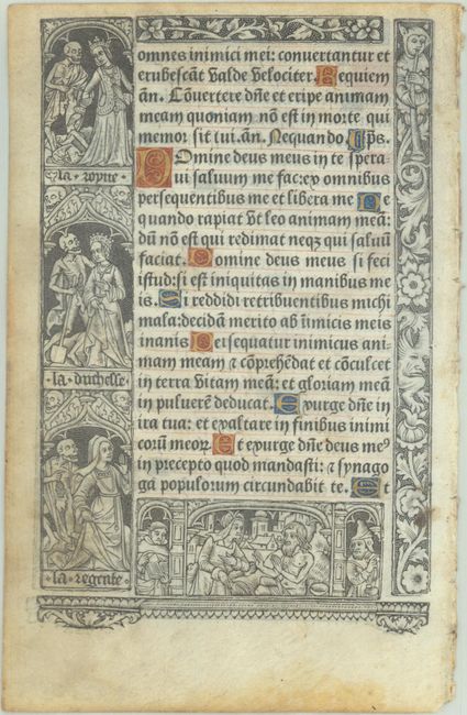 Unusual vellum leaf printed in Gothic textura type with illuminated capitals in red, blue and burnished gold leaf. The text is in Latin and is surrounded by elaborate iron engravings that include plants, animals and mythical creatures. Six of the engravings are allegories from the Dance of Death, depicting a skeleton with various individuals, including a baby, a cleric, a duchess, and a regent. Printed vellum Book of Hours leaves are very scarce, as they were only produced between 1496 and 1530. Beginning with the large "D" on recto is Psalm 6, which translates in part as:
