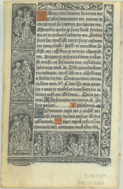 Unusual vellum leaf printed in Gothic textura type with illuminated capitals in red, blue and burnished gold leaf. The text is in Latin and is surrounded by elaborate iron engravings that include plants, animals and mythical creatures. Six of the engravings are allegories from the Dance of Death, depicting a skeleton with various female figures. Printed vellum Book of Hours leaves are very scarce, as they were only produced between 1496 and 1530. Beginning with the large "T" on recto is Job 10, which translates in part as: