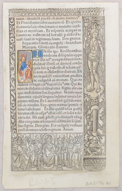 The recto of this vellum leaf includes a hand-colored image of Evangelist Mark and elaborate iron engravings that feature a female warrior and a biblical scene. This vellum leaf is from a Book of Hours printed on vellum by Gilles Hardouin for Germain Hardouin librayre demourant entre les deux portes du Palays en l’enseigne Saincte Marguerite (bookseller living between the two gates of the Palace at the sign of Saint Marguerite) of Paris.