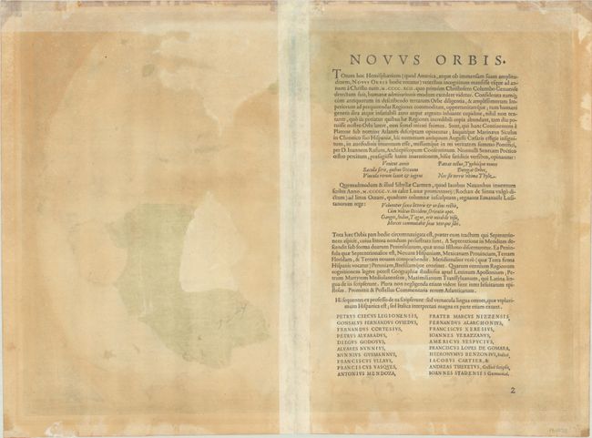 This is one of the most famous maps of America, and one that had enormous influence on the future cartography of the New World. Frans Hogenberg engraved this map, and it is primarily based on Gerard Mercator's great multi-sheet world map of 1569. The most recognizable features of the map are the bulbous Chilean coastline and the exaggerated breadth of the North American continent. North America shows a lengthy St. Lawrence River reaching across the continent to nearly meet the fictitious, westward flowing Tiguas Rio. The strategically placed title cartouche hides the unknown South Pacific and therefore most of the conjectural great southern continent, which is shown attached to both New Guinea and Tierra del Fuego.