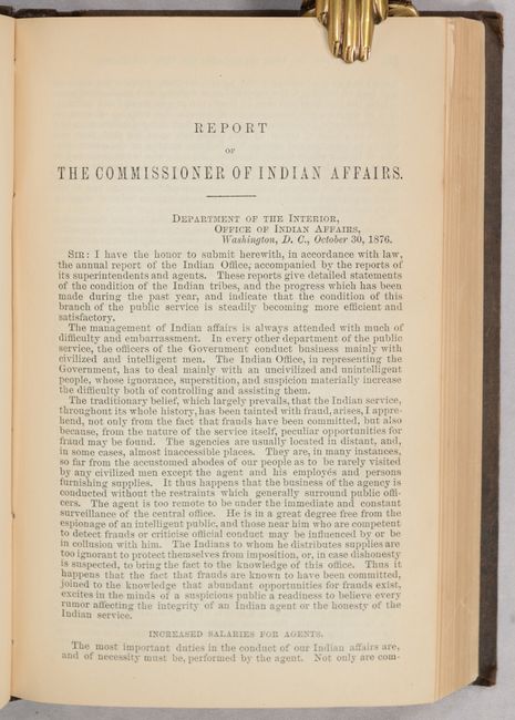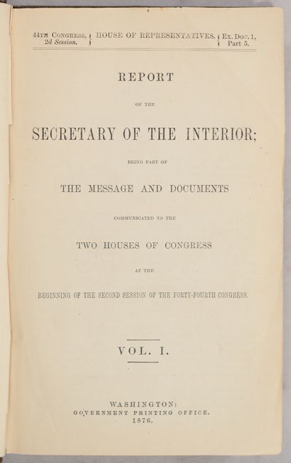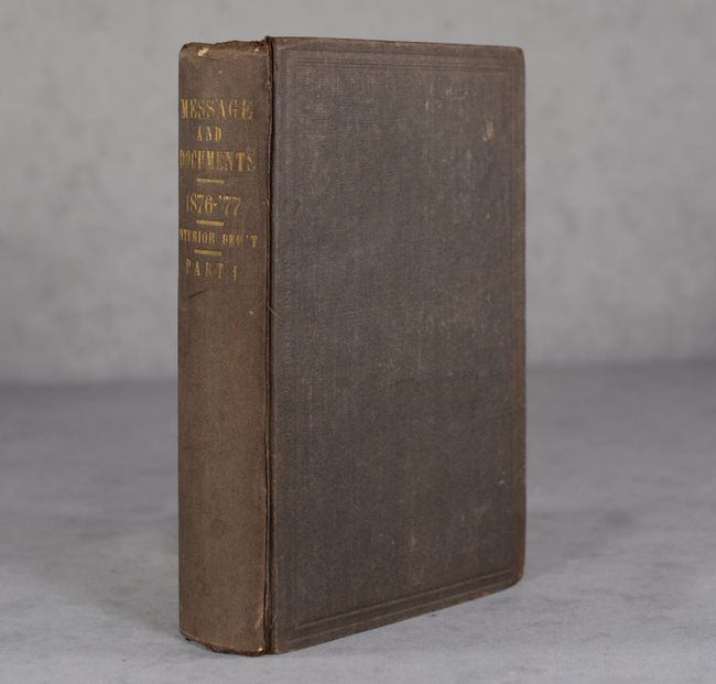 This large congressional volume features the 305-page Report of the Commissioner of Indian Affairs. Commissioner John Q. Smith describes Sitting Bull’s role in assembling a band of “desperadoes” that roamed freely and engaged in hostilities against other Indians as well as white settlers. He estimated this band to be 3,000 with 600 to 800 warriors. They were given one more chance to return to their reservations. When they failed to comply, the matter was turned over to the military. He reported that a General and Lieutenant General (presumably Terry and Custer) “were of the opinion that a movement against the ‘hostiles’ undertaken in the winter would be entirely practicable, for which none but the regular troops stationed in that part of the territory would be needed." The Commissioner acknowledged the “terrible slaughter of our forces under General Custer” and reported the hostilities have extended through the year. Custer’s battalion had about 210 troops. Even if the Indian Commissioner’s estimate of warriors was overestimated, Custer’s battalion was clearly outnumbered. The full volume is 766 pages. Hardbound in brown cloth with gilt title on spine.