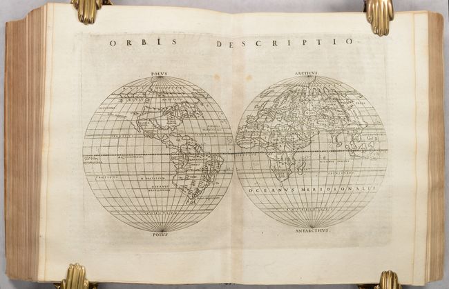 Orbis Descriptio is the first double-hemisphere world map to appear in atlas form. It is elegantly engraved in the characteristic Italian style, adapted from the oval projection used by Gastaldi, and presented on what is known as Roger Bacon's circular projection. This projection was popularized by Ruscelli and later by Rumold Mercator. Another important feature of the map is the apocryphal bulge in South America; one of the most copied cartographic errors of the 16th century. Terra Incognita is distinctly shown as a land bridge linking Asia and North America with its coastline labeled Littus incognitum. This is the first state with no southern continent.