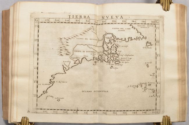 Ruscelli's important early map devoted to the East Coast of North America, Tierra Nueva, is based on Giacomo Gastaldi's map of 1548, which combined data from the Verrazano and Cartier voyages. The cartography is unchanged, with the exception of the depiction of the Hudson and St. Lawrence Rivers (unnamed), which are shown connected upriver, a notion he borrowed from Ramusio. Engraved on copper by Giulio and Livio Sanuto in the unmistakable Italian style.