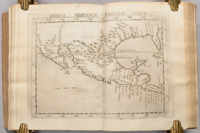 Also included is Nueva Hispania Tabula Nova, a foundation map in the cartography of the American Southwest, and a must for collectors of that region. It is an enlarged version of Gastaldi's map of 1548 with the only notable change being the peninsular Yucatan. The legendary seven cities of Ciuola are prominently depicted and Mexico City is shown floating in a large lake. The place names along the upper Gulf Coast reveal the explorations of Pineda, Cabeza de Vaca and Moscosso. The Mississippi makes its appearance as the Rio de Spiritu Santo and the R. Tontonteanc flows in the vicinity of the Colorado River.