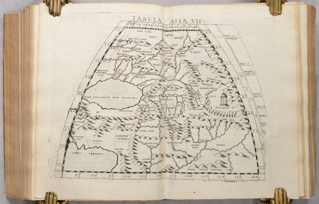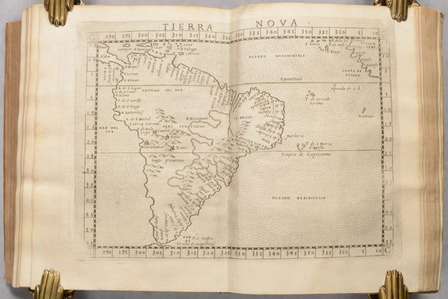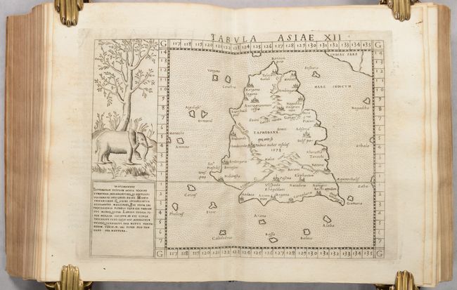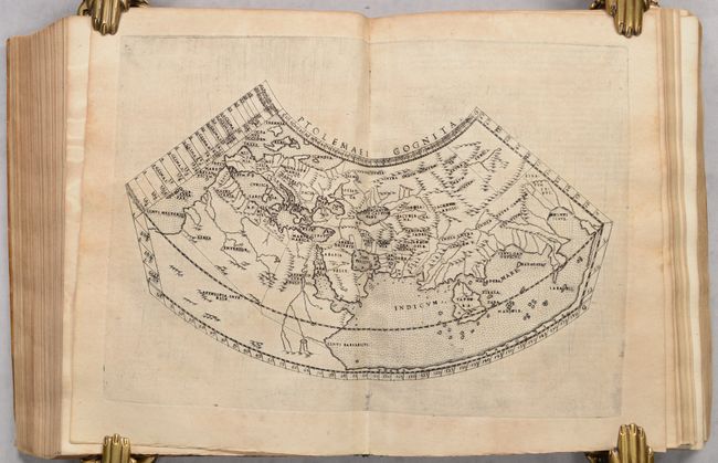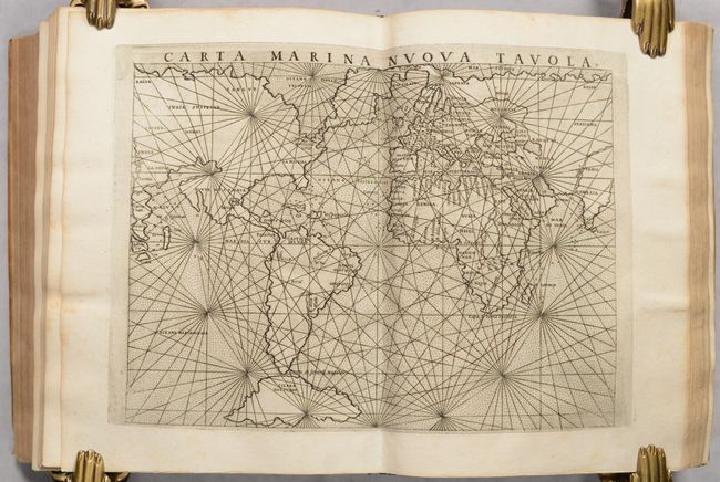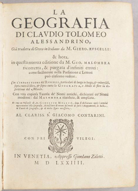 This is the third edition of Girolamo Ruscelli's translation of Claudius Ptolemy's Geographia. It was revised and corrected by Giovanni Malombra, and was printed by Giordano Ziletti. It is complete with 65 maps; 27 ancient and 38 modern, which are enlarged copies of the maps created by Giacomo Gastaldi for his 1548 edition of Ptolemy. These maps demonstrate the amazing advances in geographic knowledge taking place in this great era of exploration. They are from finely engraved copper plates, which were a great improvement over the rather crude woodcut maps in many of the earlier editions. The maps are printed from the same plates as the first edition (1561) with the exception of the Ptolemaic world map, which reverted to the original conical projection of Ptolemy. This edition also includes the additional map of Territorio di Roma. The ancient maps include the aforementioned world map, 10 maps of Europe, 4 of Africa, and 12 of Asia. The modern maps include two world maps, 18 maps of Europe, 5 of Africa, 7 of Asia, and 6 maps of the Americas.