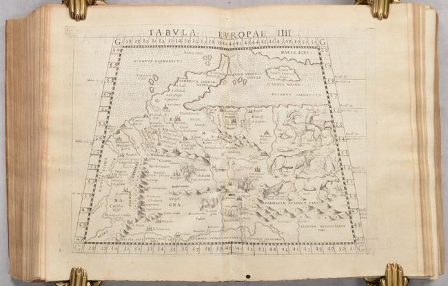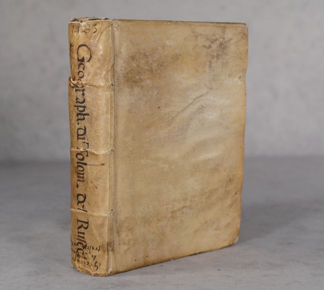 The maps have dark impressions, most with some printer's ink residue, and some with light offsetting. Most of the maps are on bright sheets, although 6 have light toning. One signature is loose and there are worm tracks along the centerfold of the map of Germania. The text has minor foxing and occasional browning. The vellum binding has some toning and staining, a few small holes, and cracks along the spine.