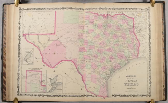 The double-page map of Texas shows county development mostly in eastern Texas and only the three large counties of El Paso, Presidio and Bexar in the west. The panhandle, noted as the Staked Plains (Elevated Table Land, without Wood or Water), includes a large section that is unorganized. There is nice depiction of the wagon roads, many named, with several completed railroads. The inset maps include a 'Plan of Sabine Lake,' 'Plan of the Northern part of Texas,' and 'Plan of Galveston Bay.' The map of the Northwest shows the newly created territory of Idaho. The map of Minnesota shows the newly created region of Dakota with an undefined western boundary.