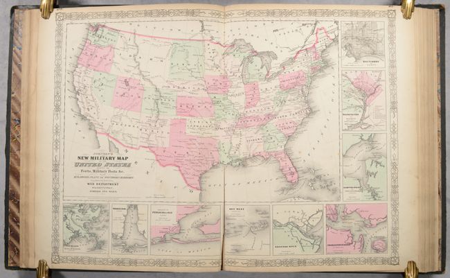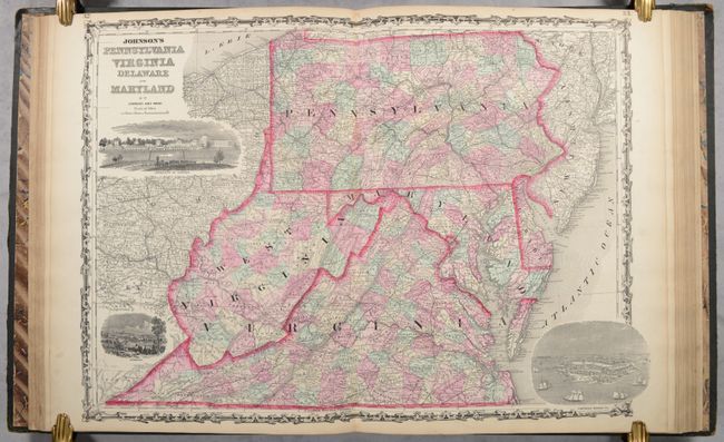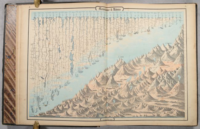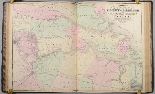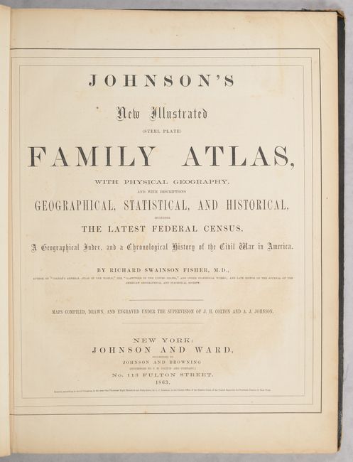 This atlas is complete with 66 beautifully rendered, steel engraved maps, including 34 double-page maps. There are several thematic maps and diagrams interspersed throughout the text that display the geology, weather, tides, agriculture, flags and animal kingdoms of the world. This 1863 edition is the last year with steel engraved plates, with many of the maps featuring vignettes, and some retaining the early strap-work style borders. It also has the desirable edition of the New Military Map of the United States which shows all state and territory boundaries rather than the limits of military divisions. And it features the un-numbered double-page Civil War map Vicinity of Richmond.