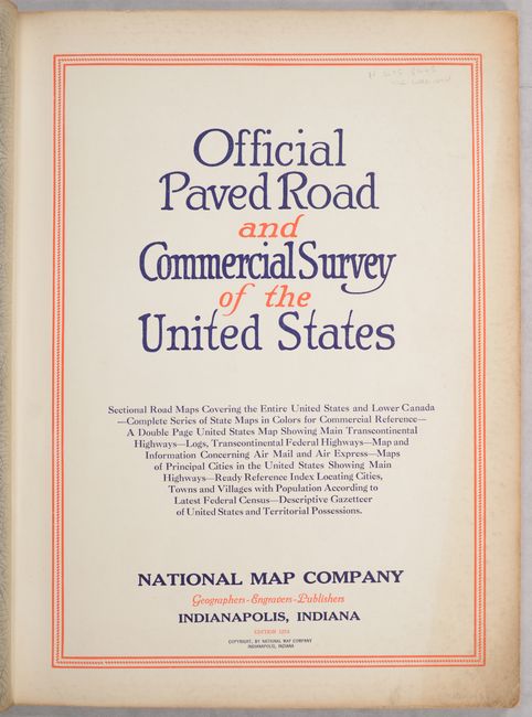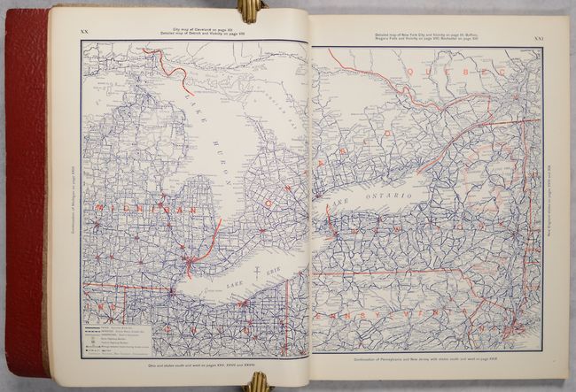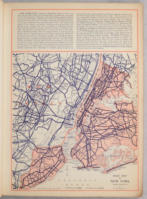 An early road atlas issued less than a decade after the formation of the Federal Highway Numbering System in 1926. This high-quality production features 30 road maps of major cities, regional road maps, a U.S. road map, and "commercial" (atlas) maps for each state. The road maps each include a key identifying paved roads, improved roads, unimproved roads, state highway numbers, and federal highway numbers. Also of interest is a map showing the emerging "air routes" as well as a map identifying national parks & monuments in the western half of the country. Soft faux leather covers with gilt title on the front cover.
