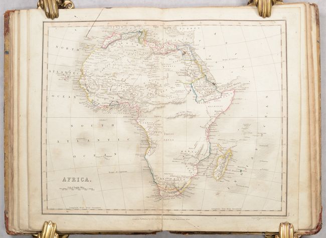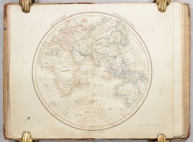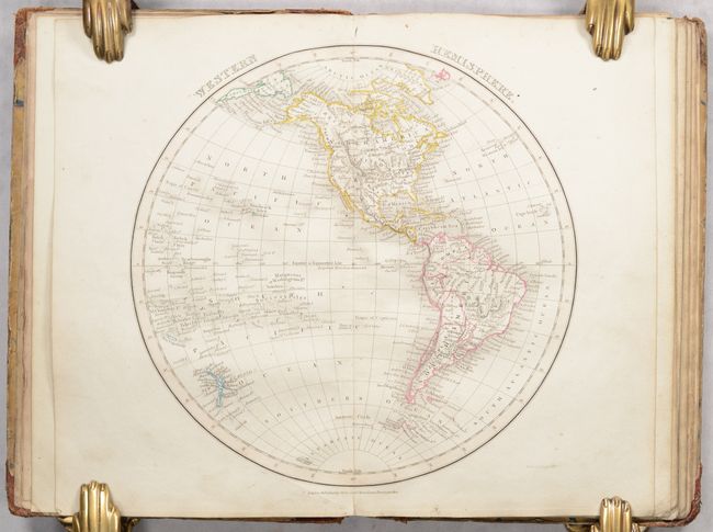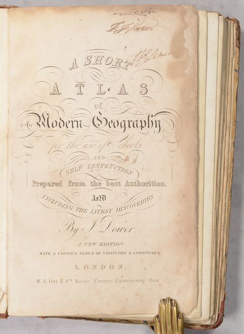 This small school atlas contains 12 double-page maps including the Eastern Hemisphere, Western Hemisphere, Europe, British Isles, England, Scotland, Ireland, France, Asia, Africa, North America, and South America. Each is filled with good detail of political boundaries, towns and cities, watersheds, topography and more. Of particular interest is the map of North America, which features a large Republic of Texas extending west to the Rio Grande and north to the 42nd parallel. To its north, a large area comprised of the Pacific Northwest and southern British Columbia is labeled "Western Territory" and appears to reflect U.S. interests in the region despite being a British publication. Interestingly, the map of the Western Hemisphere presents the opposite view - Canadian claims extend down to the Columbia River. Following the maps is an extensive 13-page index. Published by Orr & Company in London. Hardbound in quarter calf with tips over marbled boards.