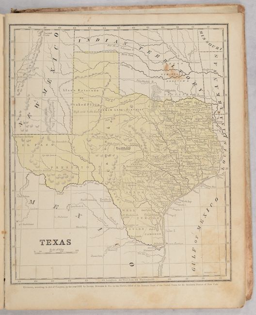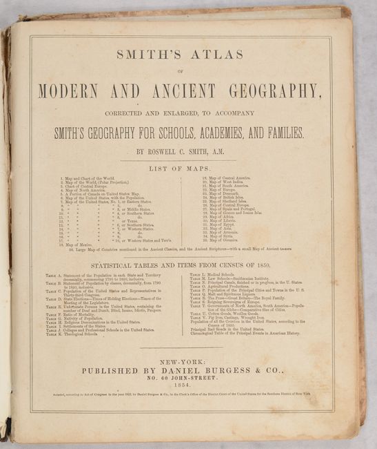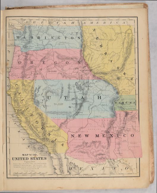This revised and enlarged edition contains 35 maps, consisting of 3 double-page and 21 single-page maps. Of particular interest is the double-page map of the United States with early territorial borders in the west. The territories of Washington and Oregon extend to the Continental Divide, and Utah is a huge area that extends from California to the Rockies. New Mexico Territory occupies all of today's Arizona and part of Colorado and the border with Mexico reflects the Gadsden Purchase. A huge Nebraska extends between the Continental Divide and Minnesota while Kansas extends west into present-day eastern Colorado. A large Gold Region is shown in north central California. The atlas also contains several regional maps of the United States including one of the Far West, a single-page map of Texas, and double-page map of the world. Pictorial paper over boards. 68 pages. Published by Daniel Burgess & Co.