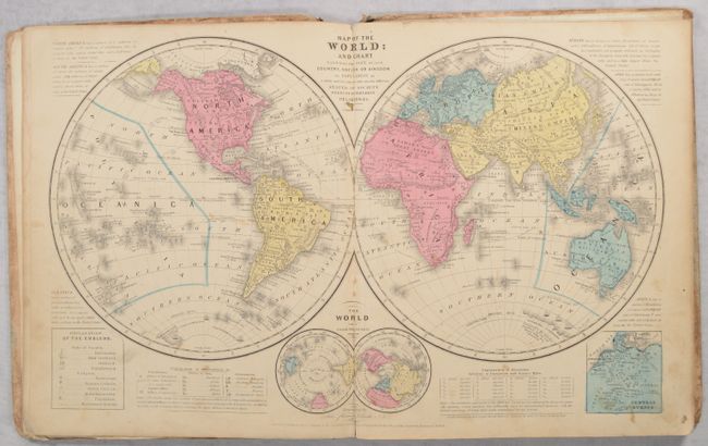 Maps have contemporary color with light toning, minor soiling, and some occasional foxing or staining. The double-page maps of the world and United States have archivally repaired centerfold separations at bottom (3" and 4.25" respectively). Covers are heavily worn and chipped along the edges.
