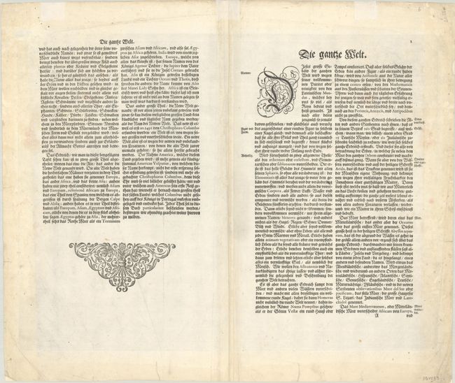 Petrus Plancius' world map of 1592 was the main source of geographical information. The map is shown on Mercator's projection with a massive Southern Continent attached to New Guinea, with the coastal names of Beach and Psittacorum regio noted from Marco Polo's travel memoirs. North America has the westward bulge characteristic of the time, with the Strait of Anian noted. Korea is shown as an island and Japan is in a kite-like shape. The map itself is richly decorated with cartouches, sea battles, monsters and compass roses. Fourth state with Tierra del Fuego shown as an island and the date omitted from the lower cartouche on the right. German text on verso, published between 1641-49.
