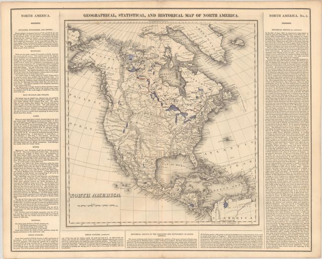 This uncommon circa 1825 edition map differs from the 1822 version in its depiction of the United States' claims in the Oregon Boundary Dispute, with a huge Missouri Territory extending well into present-day British Columbia. This edition also has a notation in northern Canada "The Sea Seen by Franklin in 1821" that did not previously appear. Texas and the Southwest are still part of Mexico, and the western mountain ranges and river systems reflect the confusing reports by early explorers. Greenland is depicted as connected to Canada, and Alaska is labeled Tchoukotches. The map is surrounded by columns of text describing the boundaries, topography, natives, and the history of the settlement of North America. Drawn by J. Finlayson and engraved by J. Yeager. Full sheet measures 21.9 x 17.5".