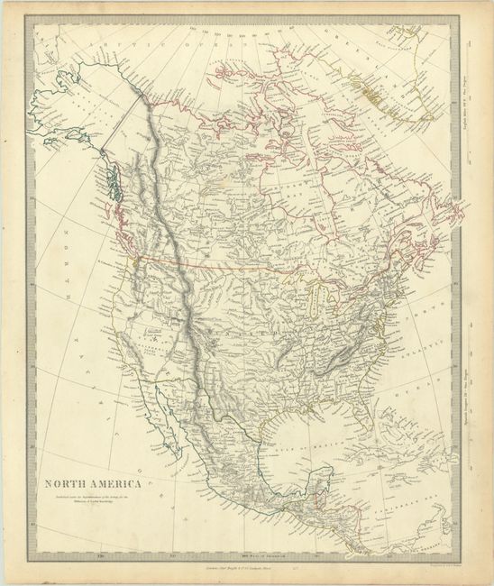 B. North America, by SDUK Society for the Diffusion of Useful Knowledge, circa 1848, hand color. This detailed and finely engraved map portrays an Independent Texas, with Mexico controlling Nueva California, although on this example the colorist has drawn the border along the Gila River. The boundary between Canada and the United States is left ambiguous, leaving the ownership of Oregon Territory (here labeled Columbia) unknown, which is unusual for a British map (the colorist on this example draws the present-day border). Filled with well-developed topography, the map names numerous forts, trading posts, and Indian tribes. The Great Salt Lake is not present, but L. Youla is located in its vicinity with the American Fur Depot on its eastern shore. The R. Buenaventura extends to the Pacific from two branches, one originating from a large swamp in the Great Basin. The course of the Snake River is fairly accurate, but the Colorado River originates too far north and rushes to the Sea of Cortez in a straight line. The map locates the 3 Butes, important landmarks on the Oregon Trail, in present-day Idaho. Lake Michigan retains its erroneous elongated shape. Distance scales outside of border give English Miles and Spanish Leagues. Engraved by J. & C. Walker and published by Charles Knight. Condition: There is light soiling with light toning confined to the sheet's edges. (B+)