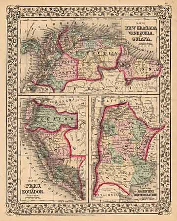 Three hand colored maps in one grapevine border with many place names and rivers. New Granada is also named "United States of Columbia". Light, scattered foxing in margins, else very good.