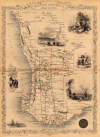 Lovely map of southwestern Australia and the vicinity of Perth. Surrounded in a delicately engraved border with seven uncolored vignettes including views between Perth and Freemantle, and of Perth from Mount Eliza, sheep herding and shearing, and Aborigines. Minor toning on fold, else fine with good margins.