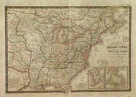 Very uncommon and finely engraved map covering all the eastern United States to about the 100th Meridian, with a bit of southern Canada. The western territories include "Ter. Du Nord Ouest" encompassing present day WI & MN, a very large Iowa that takes in all the territory north of Missouri and over to the Missouri River. Missouri is also oversized and takes in part of present day Kansas up to the Missouri River. The rest of the west is designated as Indian Districts. The eastern part of Texas is shown, and is an Independent Republic. Insets of the tip of Florida and Newfoundland. Original outline color (slightly faded), on heavy paper with very wide margins and the royal seal above the script title. Damp stain in bottom margin, well outside map.
