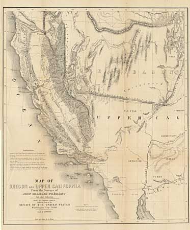 This is the smaller version of Fremont's highly respected map of the west, published by Congress, in 1850, to meet the demand for information concerning the Gold Rush. The map covers a smaller area than his larger map of the same title, eliminating Oregon and covering only the western parts of present day Arizona and Utah. "El Dorado or Gold Regions" are shown on the south fork of the American River and the upper course of the Feather River. Contains Fremont's famous topographical error, showing an east-west mountain range across the unexplored area of the Great Basin. Ref: Wheat (TMW) #613, Wagner Camp #150, Wheat (Gold) #58. Folds as issued and excellent condition.
