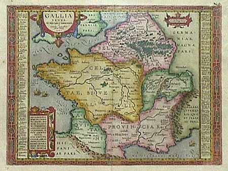 First state of this map of ancient France, which Ortelius compiled from military information in Caesar's "De Bello Gallico". The map contains less geographical detail than the similar map "Galliae Veteris Typus". Large strapwork title, dedication and scale of miles cartouches, a elaborately engraved border and panels at sides with the names of famous people. From either the 1601 or 1603 Latin edition. Superb old color.
