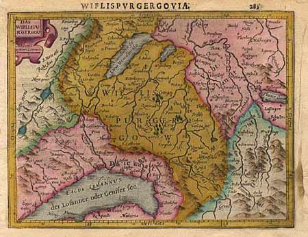 Original color highlights this map of the region including Geneva and the area north of Lake Geneva, including Bern. Strapwork title cartouche. Includes a text sheet with description in Latin. Some soil in margins.
