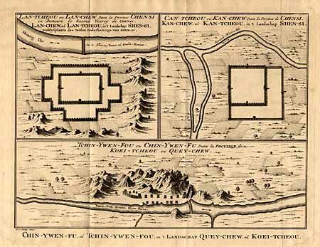 Three charts form this detailed view of three important forts in China. Each fort is surrounded by the mountains, cultivated fields and rivers. An uncommon map and sharp impression. Very light damp stain in margin.