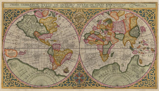 This rare world map, first issued in 1590, was based on Rumould Mercator's world map of 1587. It incorporates the improvements made by Ortelius with a re-shaped South America and inclusion of the Solomon Islands. Plancius here introduced new information, based on Portuguese reports, on the farwest coast of America and the western coastline of Africa. Japan is shown for the first time as one small and three larger islands. This rare example is state 3 from a Dutch Bible with the attribution D.R.M. Mathes. It is beautifully engraved in a strapwork surround with a compass rose and armillary sphere tucked between the hemispheres. Attractive later coloring. Folds reinforced with Japanese tissue on verso. Ref: Shirley #177