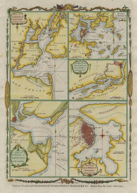 A very attractive sheet with five maps, each with its own decorative title cartouche. Plan of the Harbour of New-York and Parts adjacent, The Town & Harbour of Boston &c., Draught of the River Delaware from Chester to Philadelphia, Plan of the Harbour of Charles Town, South Carolina, and Plan of the City & Harbour of Havanna, Capital of Cuba. Each map is very detailed. The maps are enclosed in an engraved garland surround.