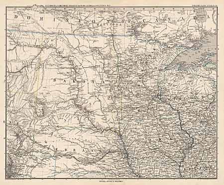 An untitled map of Dakota Territory and the adjacent states o Minnesota, Iowa, Nebraska, and parts of Wisconsin, Illinois and Wyoming. The detail in this German map is remarkable, including Indian names and reservations, topographical features, railroads and the tracks of explorers.