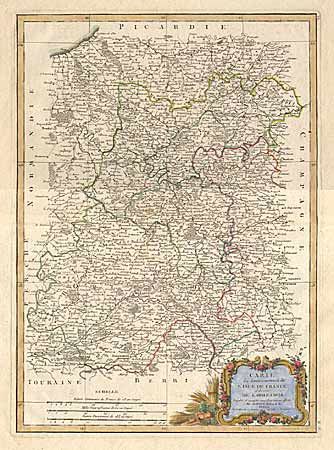 Detailed copper engraved map of central France. Fontamebleau and Paris are near the center. Hundreds of town and cities are shown, along with forests and roads. Fully colored, decorative title cartouche.
