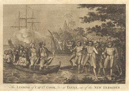 Capt. Cook attempting a peaceful landing, holding out a palm leaf, as his boat approaches a beach full of agitated natives. In Cook's boat are several lovely young ladies.