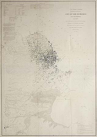 The chart stretches from North Point to Mission de Delores and Pt. San Quentin. Streets are clearly laid out and named, contour lines at 20 ft. intervals show elevation. Extant buildings are shown in black along the streets. Sixteen public buildings and 15 reservoirs are named in key.