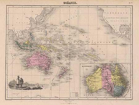 Includes all of Southeast Asia, Philippines, Australia, New Zealand and the South Pacific Islands. Large inset map of Australia with additional detail. Vignette of a Polynesian couple and baby.
